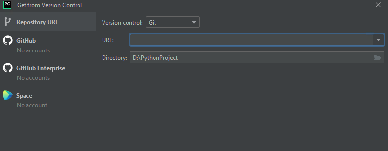 VCS->Get from Version Control,输入 Git 仓库的地址和本地目录。
