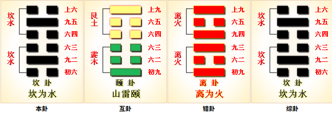 - 坎有险,求小得 : 在险中,未脱离风险,主动谋求小事可得,大事不行。阳刚居中,虽仍在险中,但可凭刚健居中之德,谋取小成,但谨慎太过谋大 。