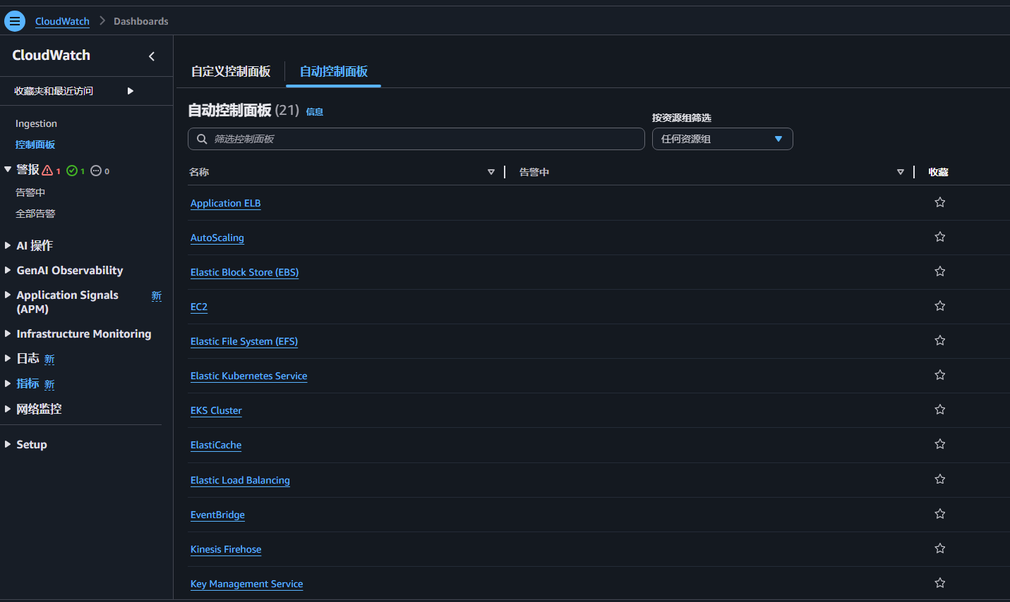CloudWatch 默认提供了很多 Dashboard,也可以自定义自己喜欢的仪表盘(Create Dashboard)