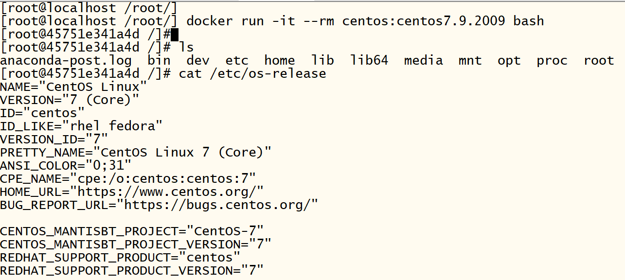 进入容器后,我们可以在 Shell 下操作,执行任何所需的命令。例如执行 cat /etc/os-release。容器中执行exit命令可以退出容器