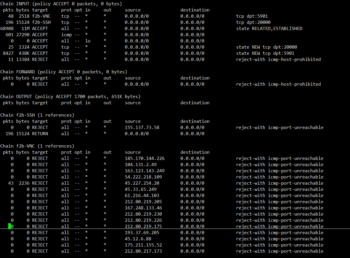 $ fail2ban-client status vnc Status for the jail: vnc |- Filter | |- Currently failed: 22 | |- Total failed: 52632 | `- File list: /home/cosmos/.vnc/cosmos:1.log.bak `- Actions |- Currently banned: 18 |- Total banned: 18 `- Banned IP list: 212.80.219.226 212.80.219.175 175.211.155.52 ...