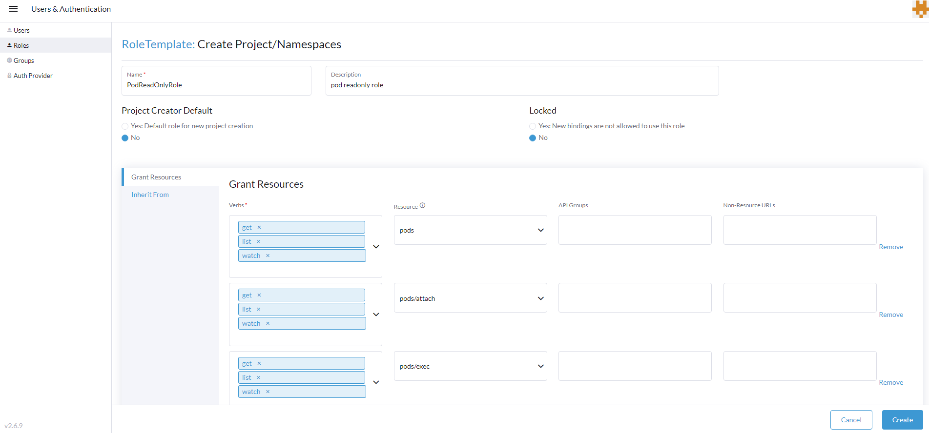 点击Create Project/Namespaces Role,创建 Role,按照下图,填入对应信息