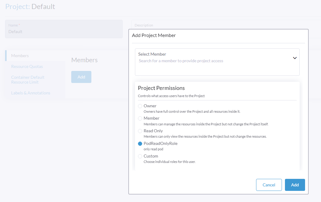 在Members中选择Add为Project绑定User和Project Permissions,本示例中,权限选择PodReadOnlyRole