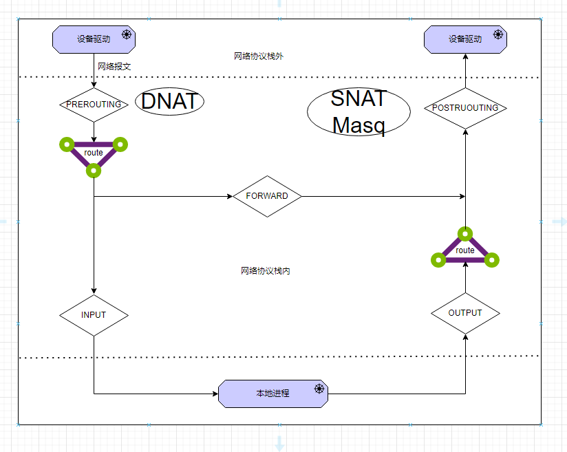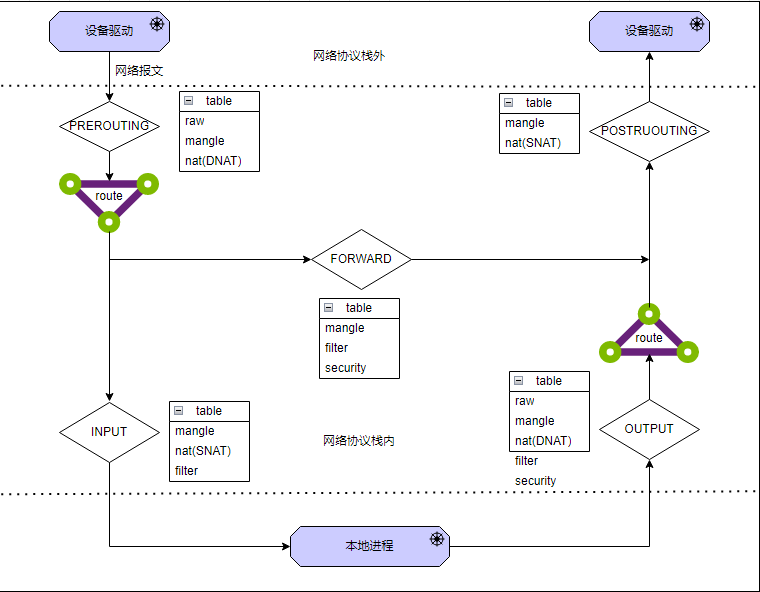 raw-iptables是有状态的,即iptables对数据包有连接追踪 (connection trackong) 机制,而raw可以用来去除这种追踪机制mangle- 用于修改数据包的 IP 头信息nat- 用于修改数据包的源或者目的地址filter- 用于控制到达某条链上面的数据包是继续放行、直接丢弃(drop)、或拒绝(reject)security- 用于在数据包上面应用 SELinux