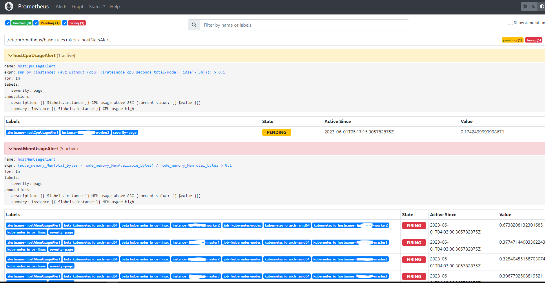 配置生效后,可以在 Prometheus 的 Web 的 Status --> Rules 下看到所有的告警规则,也可以在 Alerts 中看到所有的告警规则及其状态