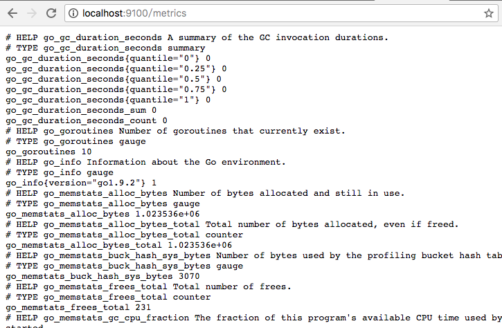 访问 http://localhost:9100/metrics,可以看到当前 node exporter 获取到的当前主机的所有监控数据,如下所示: