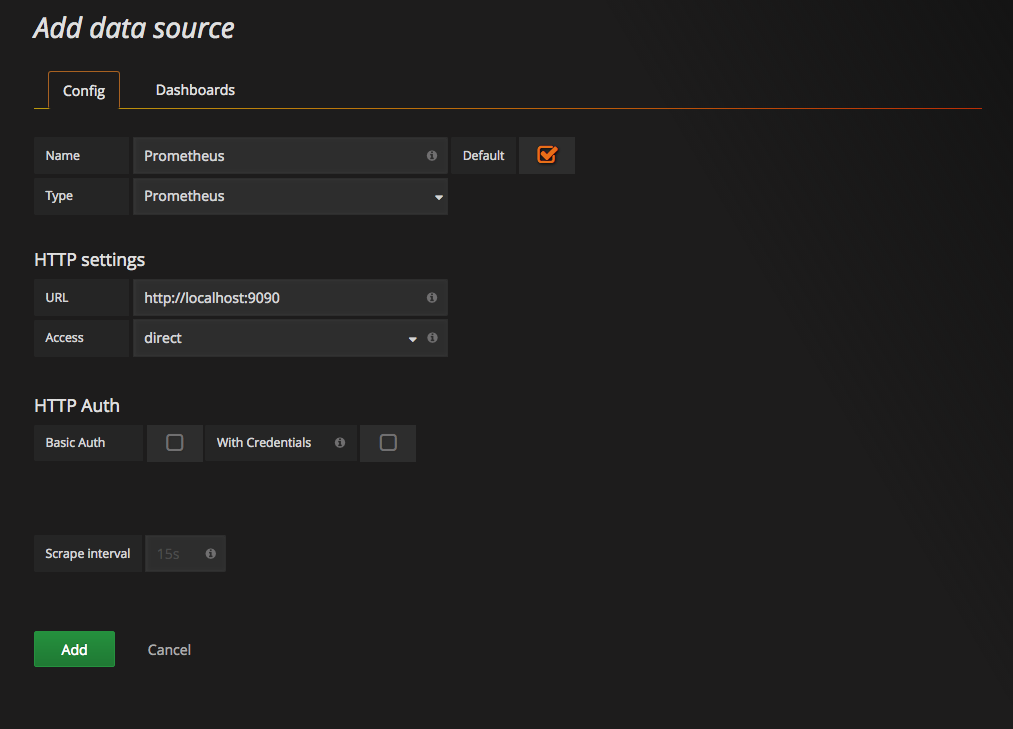 这里将添加 Prometheus 作为默认的数据源,如下图所示,指定数据源类型为 Prometheus 并且设置 Prometheus 的访问地址即可,在配置正确的情况下点击 Add 按钮,会提示连接成功的信息