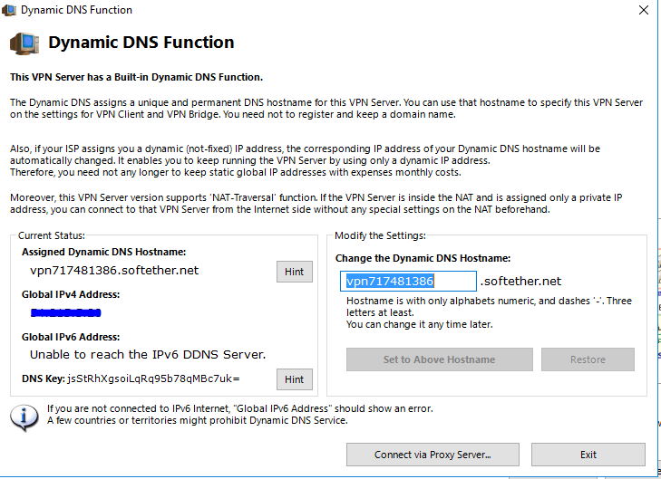 根据提示,配置要创建的 Virtual Hub 的名称,接着会弹出 Dynamic DNS Function 配置界面。Dynamic DNS Function 的功能,会提供一个 softether.net 域的子域名,通过这个域名,可以解析到 VPN Server 的 IP 地址,如果服务器使用的是动态 IP,此解析会跟着变化。如果服务器只有内网 IP(云主机),此解析会自动解析到公网 IP。