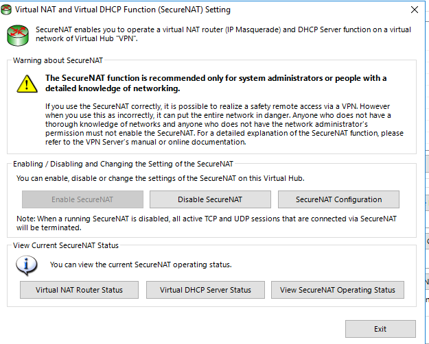回到管理界面后,选择刚刚创建的 Virtual Hub,点击 Manage Virtual Hub 按钮管理配置,选择 Virtual NAT and Virtual DHCP Server(SecureNAT),启用 SecureNAT,否则客户端可以连接到 VPN Server,但是 VPN Server 不会分配 IP 地址给客户端。