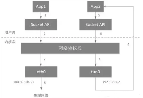 - tun0 网卡收到数据包,将数据包写入 /dev/tun0,/dev/tun0 由 App2 打开,于是 App2 获得了数据包