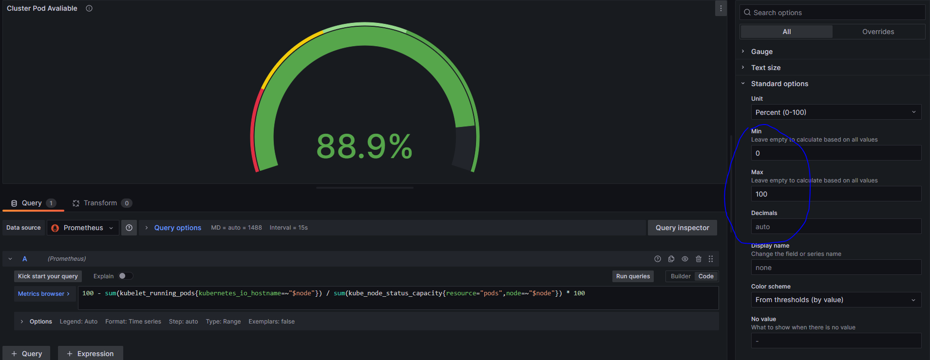 要使 Gauge 仪表盘内部显示度量值,需要配置 Standard options –> Min、Standard options –> Max、 Standard options –> Decimals
