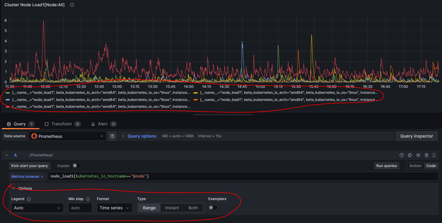 默认情况下,Legend 会显示指标中的所有标签,会比较长,为了缩短简化 Legend,需要自定义 Legend。在 图形的编辑界面,表达式下的 Options 中,选择 Legend 进行自定义,可以使用已有的标签 {{label}},或者 Variables $variable 来格式化 Lengend