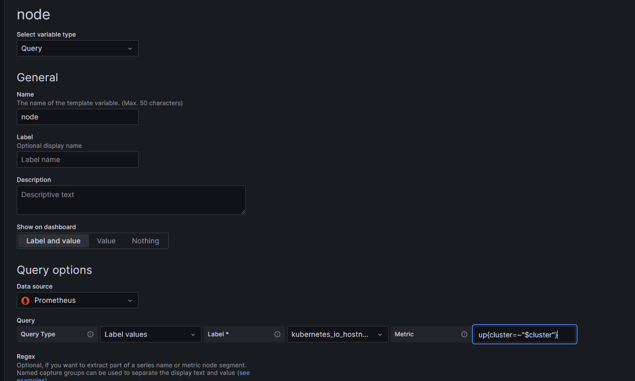 variable type选择Query Data source选择对应的 PrometheusQuery中选择Query Type为Label values,Label *选择kubernetes_io_hostname,后面的Metric中配置表达式up{cluster=~"$cluster"}以限制筛选结果这里的 主要配置为
