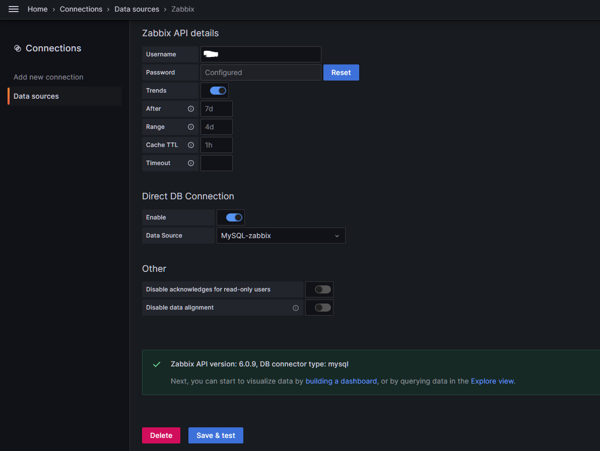 Zabbix添加为 Data Source,使用 Zabbix 的 API 链接及认证用户名和密码配置 Data source,配置Direct DB Connection为Enable并选择数据库为第一步配置的 Mysql Data source