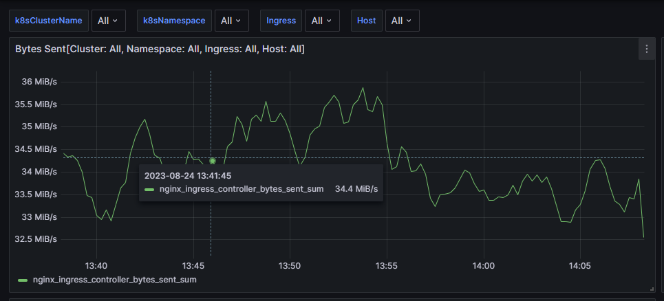 使用表达式: sum(rate(nginx_ingress_controller_bytes_sent_sum{cluster_name=~"$k8sClusterName", namespace=~"$k8sNamespace", ingress=~"$Ingress",host=~"$Host"}[2m]))