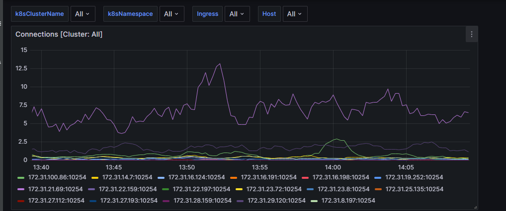 k8sClusterName label_values(cluster_name)k8sNamespace label_values(kube_namespace_labels{cluster_name=~"$k8sClusterName"},namespace)Ingress label_values(kube_ingress_info{cluster_name=~"${k8sClusterName}", namespace=~"${k8sNamespace}"},ingress)Host label_values(kube_ingress_path{cluster_name=~"$k8sClusterName",namespace=~"$k8sNamespace",ingress=~"$Ingress"},host)