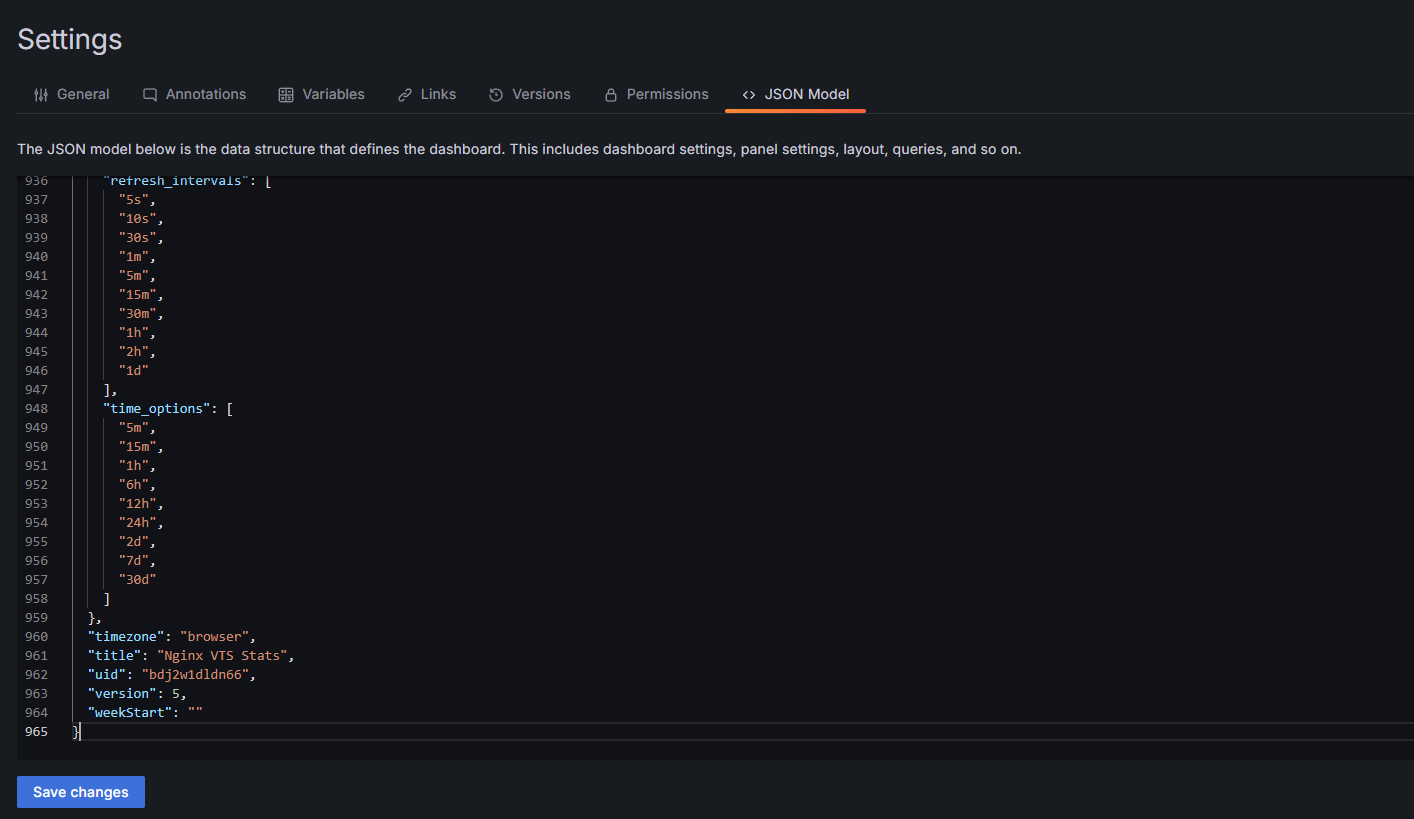 Dashboard settings,在设置页面中选择JSON Model,点击左下角的Save changes。重新刷新或者重新登陆后,Dashboard 顶部的选择下拉选项默认值都为All