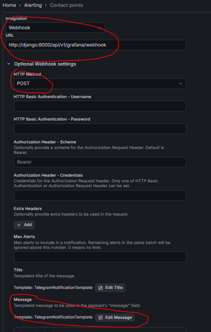 Telegram API 接收消息长度有限制(4096 字符),如果 Grafana 告警消息太多,会发送失败,导致无法正常通知告警。为了绕过此限制,可以在 Contact Points 中使用 Webhook 转发消息到自定义的接口,在自定义接口中实现对消息的拆分并转发到 Telegram,本示例中 Grafana Contact Points 的 Webhook settings 如下图,要注意圈出来的地方