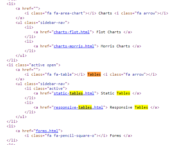 <li> <a href=""> <i class="fa fa-area-chart"></i> Charts <i class="fa arrow"></i> </a> <ul class="sidebar-nav"> <li> <a href="charts-flot.html"> Flot Charts </a> </li> <li> <a href="charts-morris.html"> Morris Charts </a> </li> </ul> </li> <li class="active open"> <a href=""> <i class="fa fa-table"></i> Tables <i class="fa arrow"></i> </a> <ul class="sidebar-nav"> <li class="active"> <a href="static-tables.html"> Static Tables </a> </li> <li> <a href="responsive-tables.html"> Responsive Tables </a> </li> </ul> </li> <li> <a href="forms.html"> <i class="fa fa-pencil-square-o"></i> Forms </a> </li>