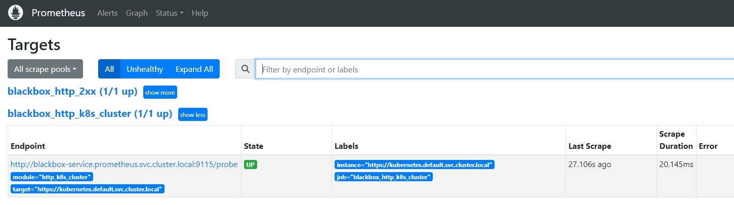 - job_name: 'blackbox_http_k8s_cluster' scrape_interval: 60s metrics_path: /probe params: module: [http_k8s_cluster] # Look for a HTTP 200 response. static_configs: - targets: - https://kubernetes.default.svc.cluster.local relabel_configs: - source_labels: [__address__] target_label: __param_target - source_labels: [__param_target] target_label: instance - target_label: __address__ replacement: blackbox-service.prometheus.svc.cluster.local:9115