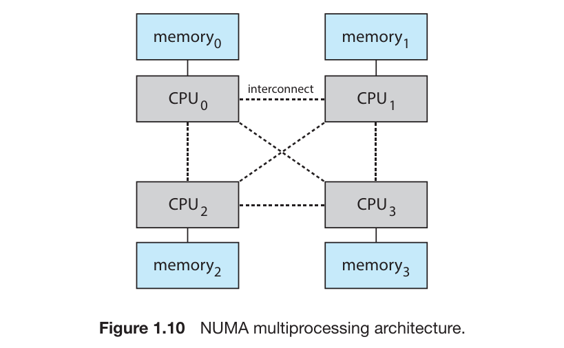 为了避免太多 Processors 争抢系统总线造成的性能下降,一个可选的 方法是为每个 CPU(或 CPU 集)提供专用的本地内存,CPU 通过一个更小更快的本地 bus 连接专用的本地内存。所有的 CPU 通过一个 内部通信系统 进行连接,所有 CPU 共享同一个物理地址空间,这种架构被称为 Non-uniform Memory Access (NUMA)
