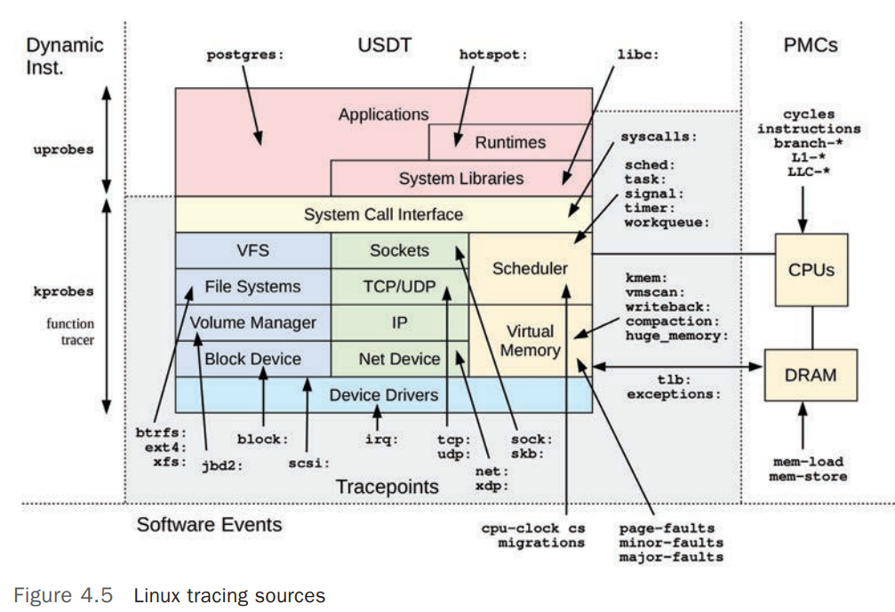 | System-wide Tracing | Function profiling (Ftrace), tracepoints, software events, kprobes, uprobes, perf_event |