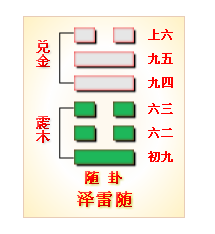 随,上(外)兑(泽、悦)下(内)震(雷、动),动而悦,象征着顺应(时势)、顺势而为、随时势而动。