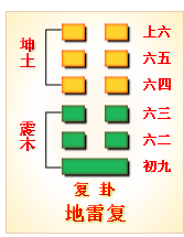 地雷复,上(外)坤(地、顺)下(内)震(雷、动),内动外顺,雷在地中,象征阳气复生,一阳复生而五阴顺阳,阴顺阳生。是继 剥卦 剥极而复、阳气回升的卦。