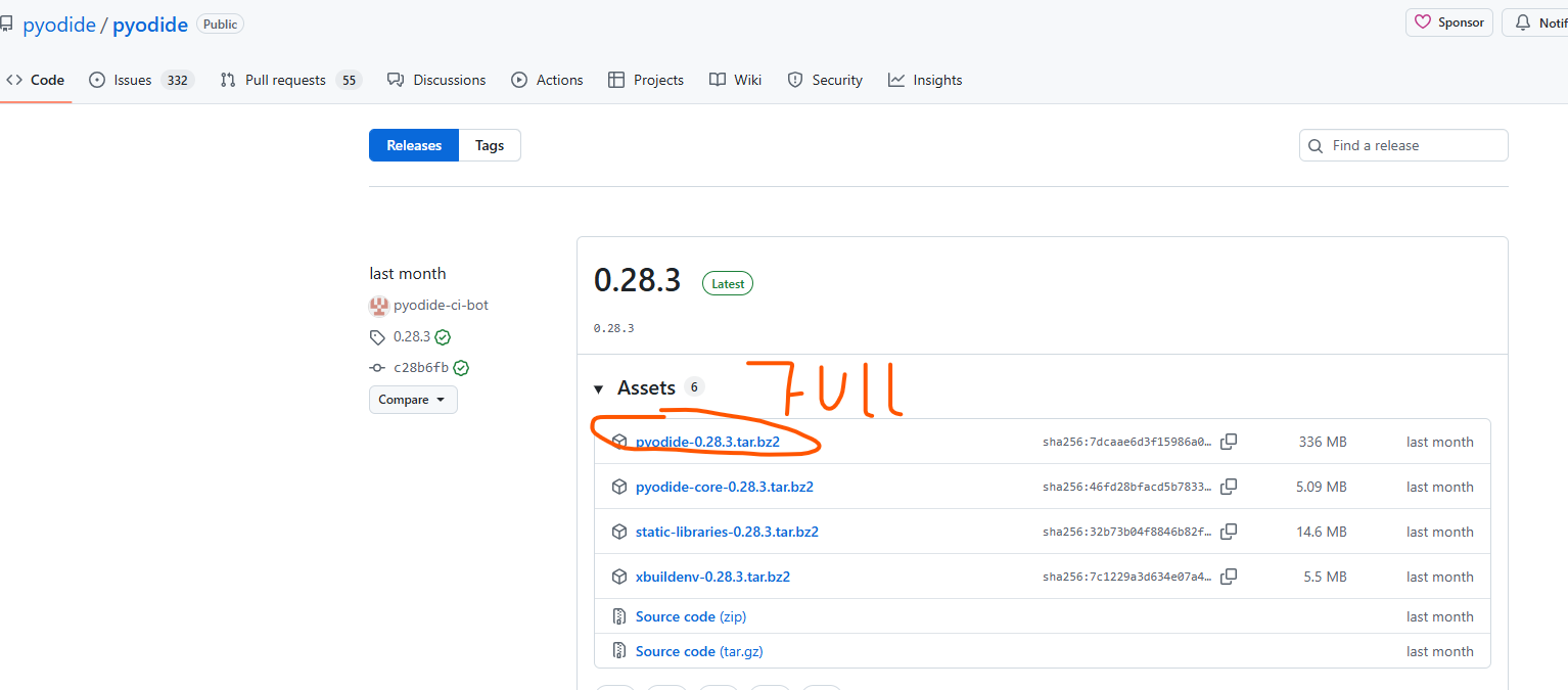 - 用于浏览器扩展或本地部署(例如前端中直接运行 Python),通常选择 “full distribution” 版本,即包含所有 vendored 包(第三方库预打包)的大包。通常文件比较大(300多M)