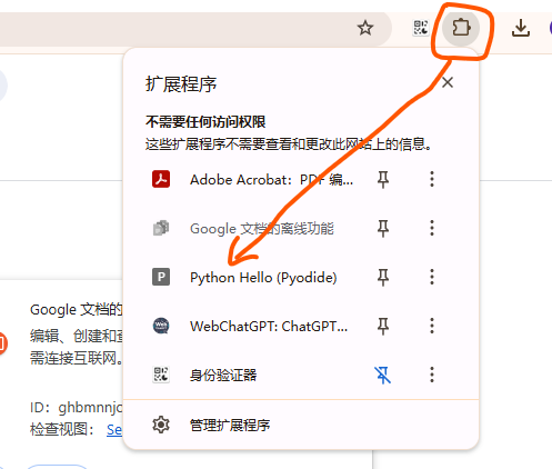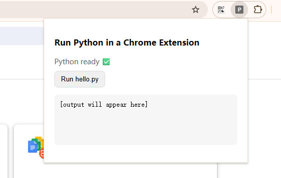 Python 文件,本示例以输出内容为例print("hello world from Python inside a browser extension!")