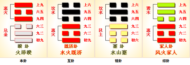 火泽睽,内(下)兑(泽、口、悦)外(上)离(火、附丽、文明),上火下泽,两相乖离,相违不相济,水火不容,相互矛盾。睽,乖异、不同、不合、背离、矛盾之卦。
