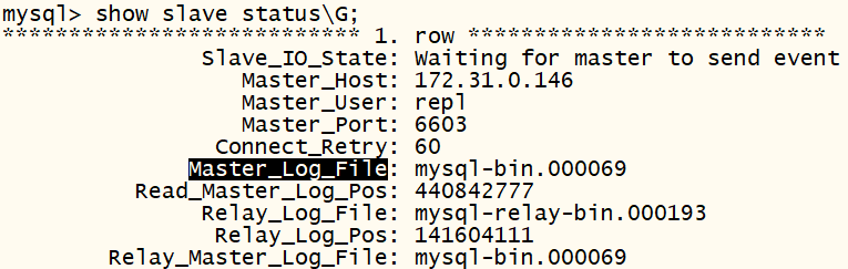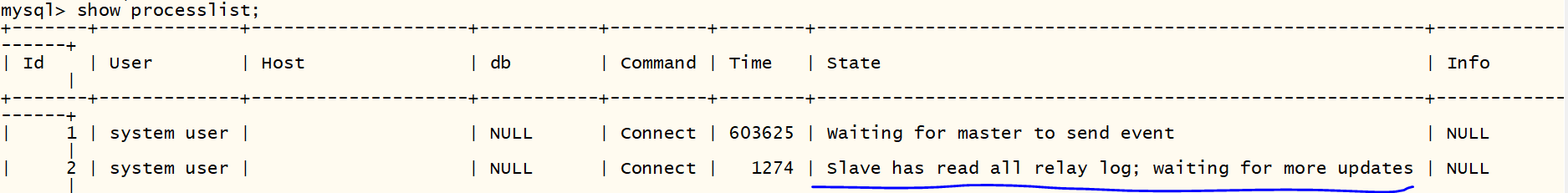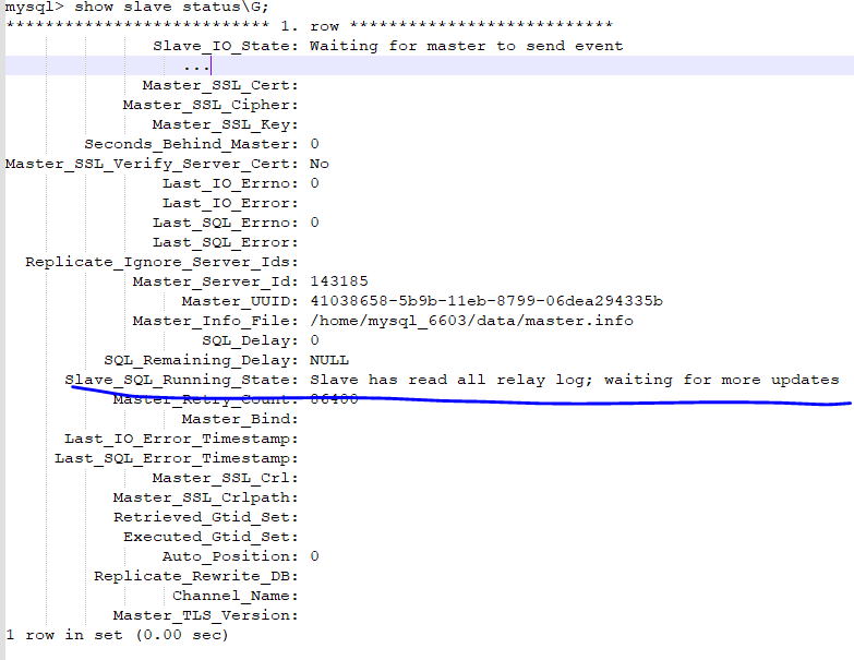 当输出中Slave_SQL_Running_State 为 Slave has read all relay log; waiting for more updates,表示更新都执行完毕。