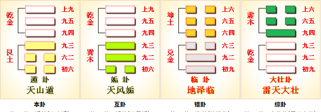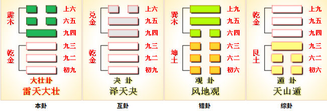 大壮卦,下(内)乾(天、健)上(外)震(雷、动),为十二消息卦之一,阴消阳息,阳长阴退,为阳气大盛之时。大壮,大者壮也,刚爻为大,柔爻为小。大壮则止,大壮是刚爻壮大(四个刚爻,两个柔爻),是较好的格局,在往前就要物极必反,因此要止。天山遁为退,雷天大壮为止。