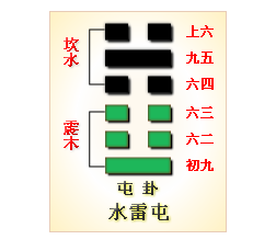 - 动乎险中,大亨贞 : 震为雷为动,坎为水(云)为险,事物虽然刚刚萌生,力量尚弱,根基不稳,面临艰难(难),但只要依正道(驯致其道,建侯),结果必然不错(大亨贞)